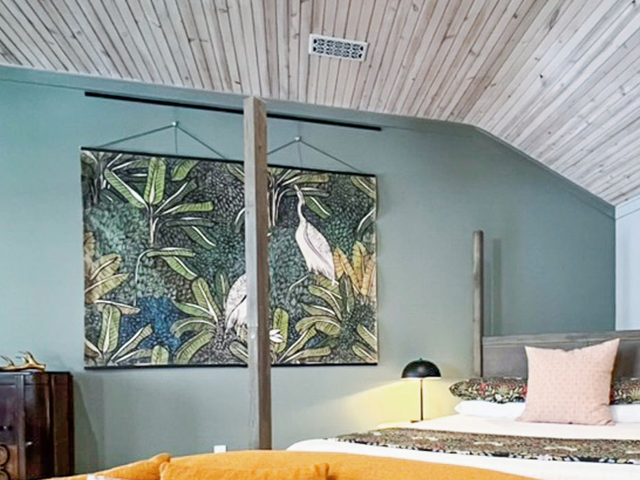 At the heart of the suite is a cozy four-post queen bed, inviting deep rest and slow mornings. Surrounded by calming tones, soft rugs, and natural light, this sleeping space is designed to support quiet renewal—whether you’re drifting off after a long day or waking up to the sounds of birds and breeze.